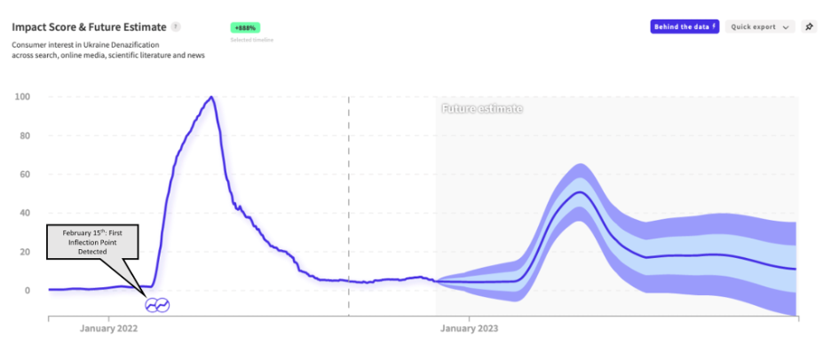 This past February 15th, just over a week before the Russian invasion, NWOโs algorithms detected a Russian disinformation inflection point. A stream of Russian news articles and social media posts were calling for the โDenazification of Ukraine.โ At the time, Putin falsely claimed that Ukrainian Neo-Nazi forces were committing โgenocideโ in the Donbas region. As the invasion drew closer, more misinformation came out of Russia to preemptively justify an attack. NWO.ai was able to quantify and measure the distribution of the misinformation narratives, in this example with โUkraine Denazification,โ across social media and news, to forecast the growth in these signals.