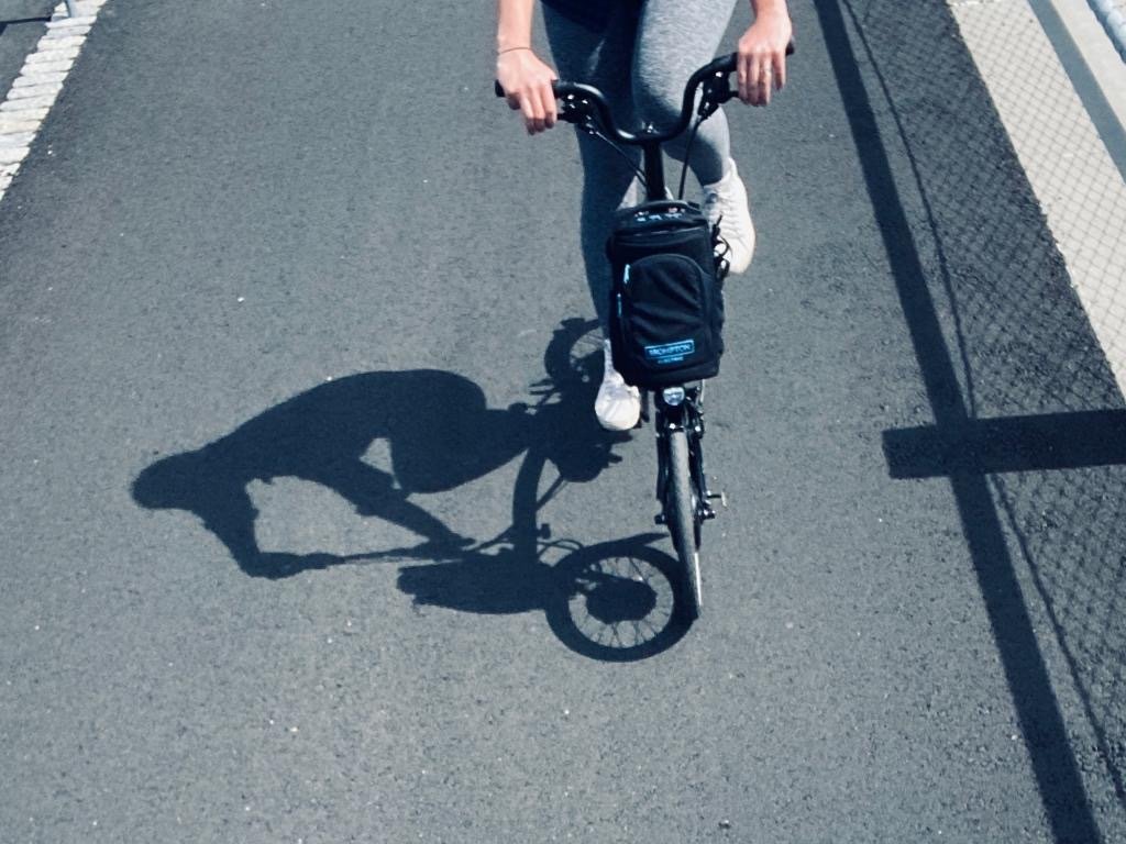 The bike really can go fast if you want it to, and as the electric throttle kicks, an instantaneous and broad smile forms; you can see the quizzical look on people’s faces as this small wheeled invention speeds past. As I pedaled, I realized that in the highest setting you really don’t have to try too hard and this would allow me to wear formal clothes and not break a sweat. The battery is built into a bag so I could carry my laptop and things without the need for a backpack. When folded, it is small and can easily be put onto a train or carried upstairs and stored in any nook of an apartment.