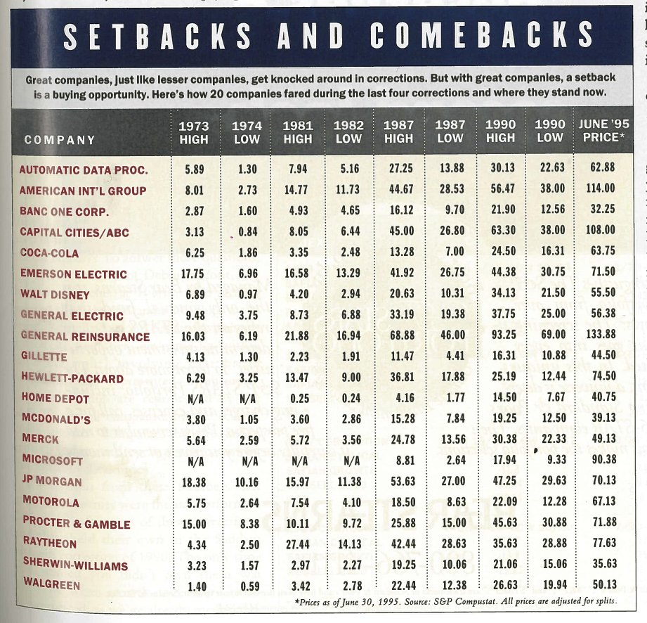 This table (below) shows a few examples of how the four nastiest corrections in recent history (1973-74, 1981-82, 1987, and 1990) actually paid us a favor by giving us the chance to buy great companies at fire-sale prices. If itโs happened before, it will happen again.