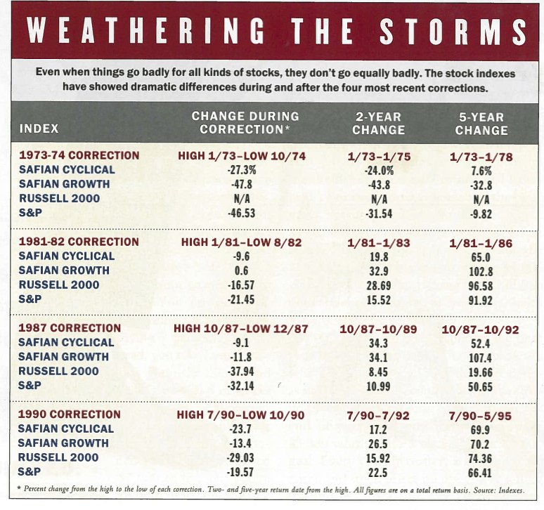 How have different types of companies fared in those four corrections? Do all stocks correct equally? To answer those questions, I enlisted the help of Deborah Pont, my dogged researcher at Worth, who in turn enlisted the help of Standard & Poorโs, the Frank Russell Co., and Safian Investment Research. Together, we came up with a large table (below) involving four broad categories, each represented by an index. Large companies are represented by the S&P 500; small companies by the Russell 2000; growth companies by the Safian growth index; and cyclical companies by the Safian cyclical index.